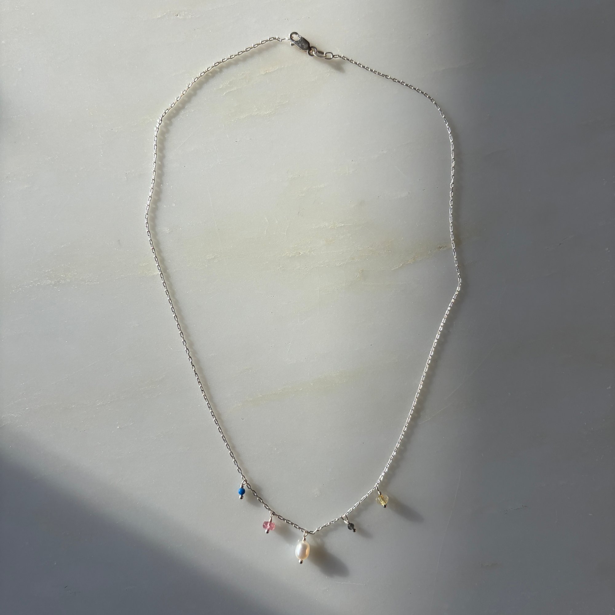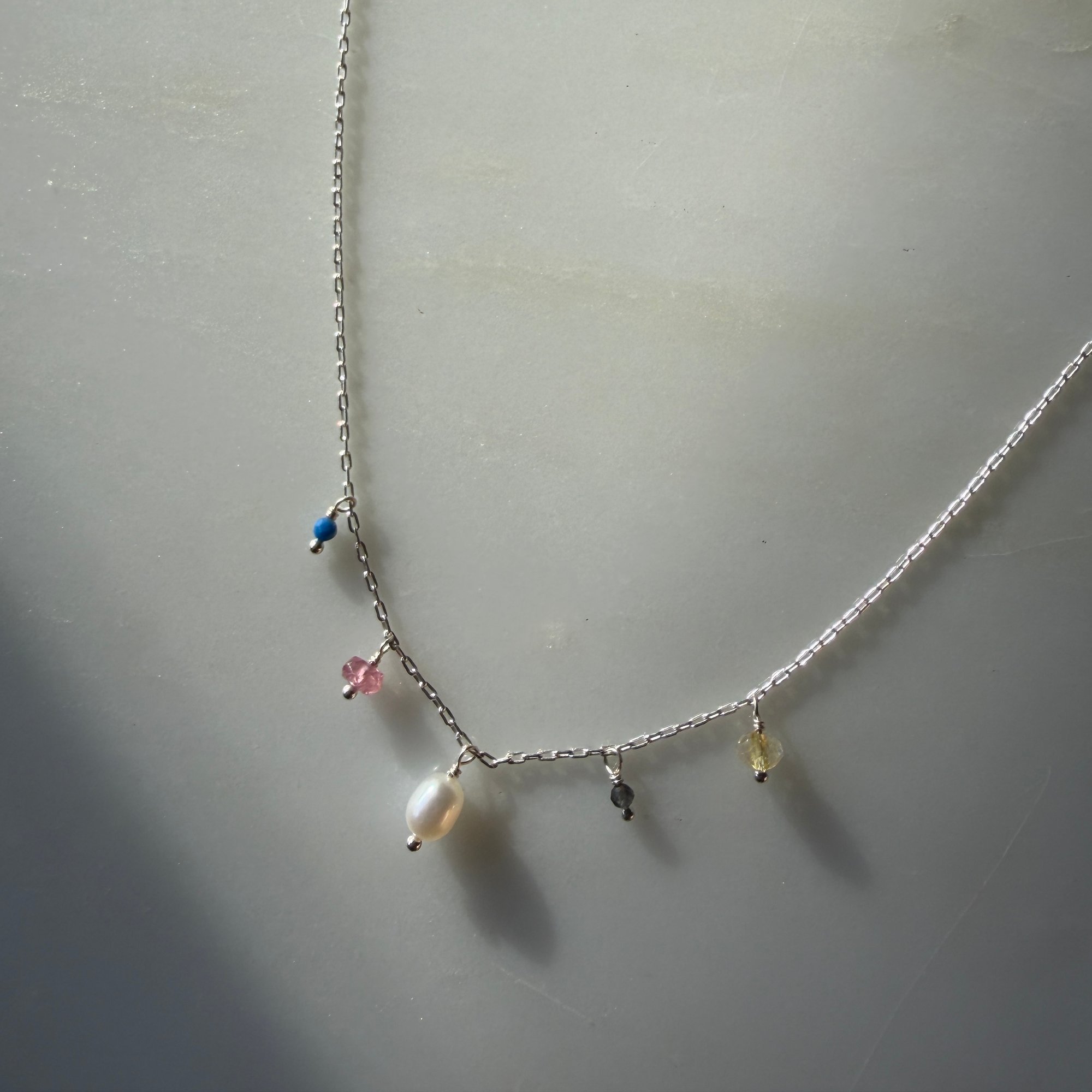 lapis, tourmaline, pearl, smoky quartz and citrine along a sterling silver chain