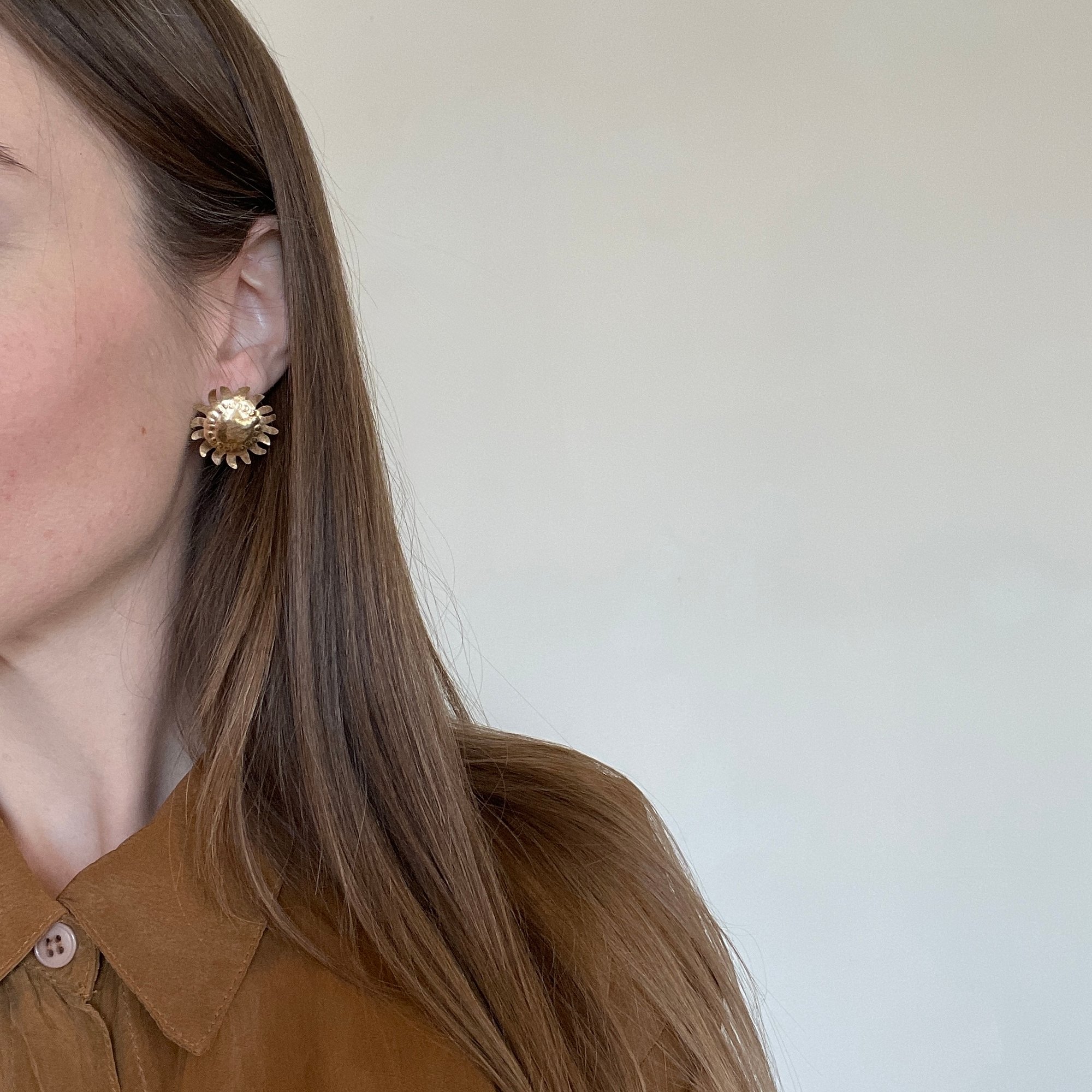 hand fabricated brass earrings textured with handmade stamps, a nod to the winter solstice