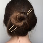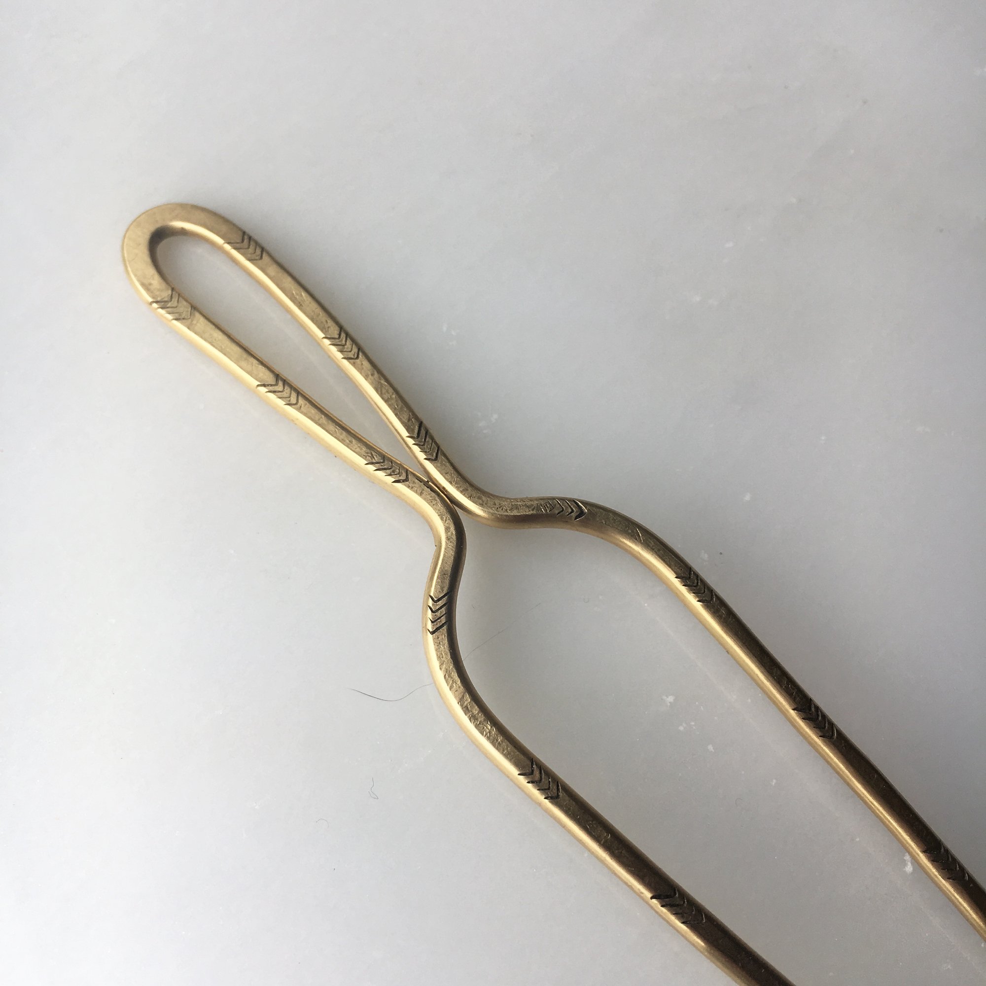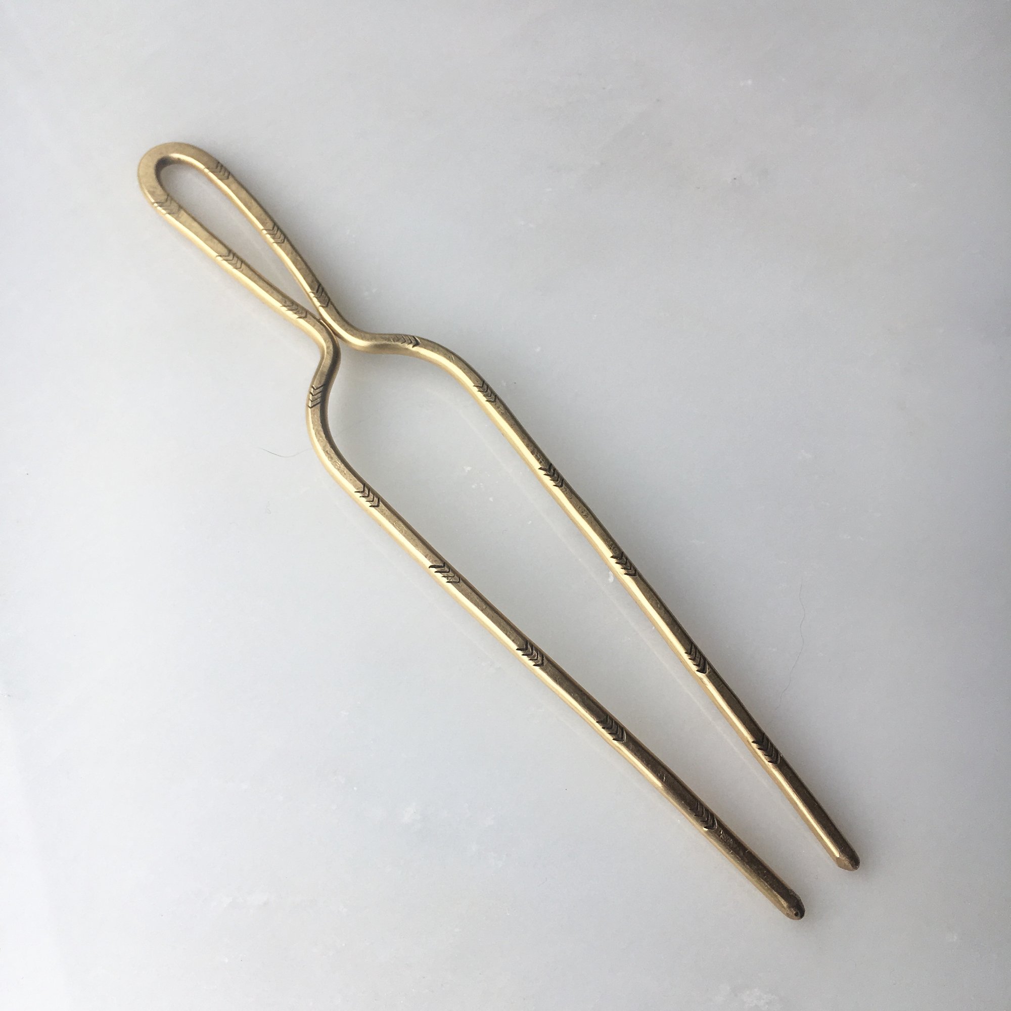 hand fabricated sturdy brass hair pin with stamped detail on both sides