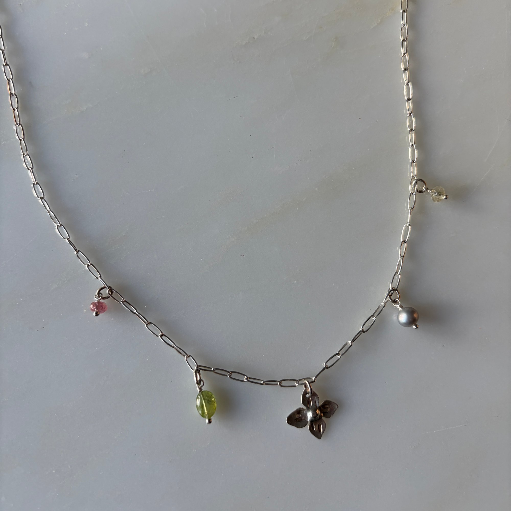 hand fabricated botanical pendant textured with handmade stamps along a sterling silver chain with tourmaline, peridot, pearl, citrine