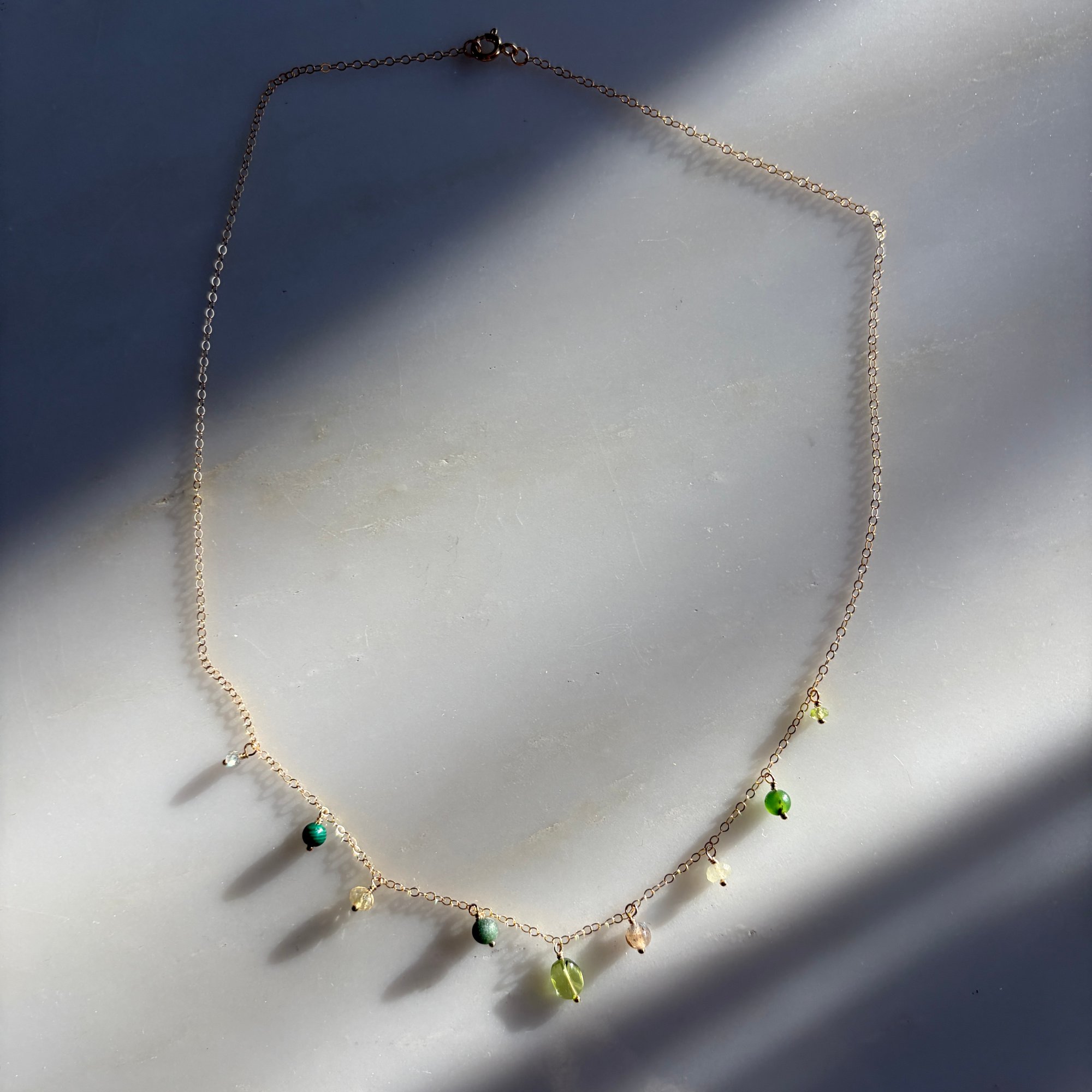 tonal stones along a 14k gold filled chain, reminiscent of peak summer foliage