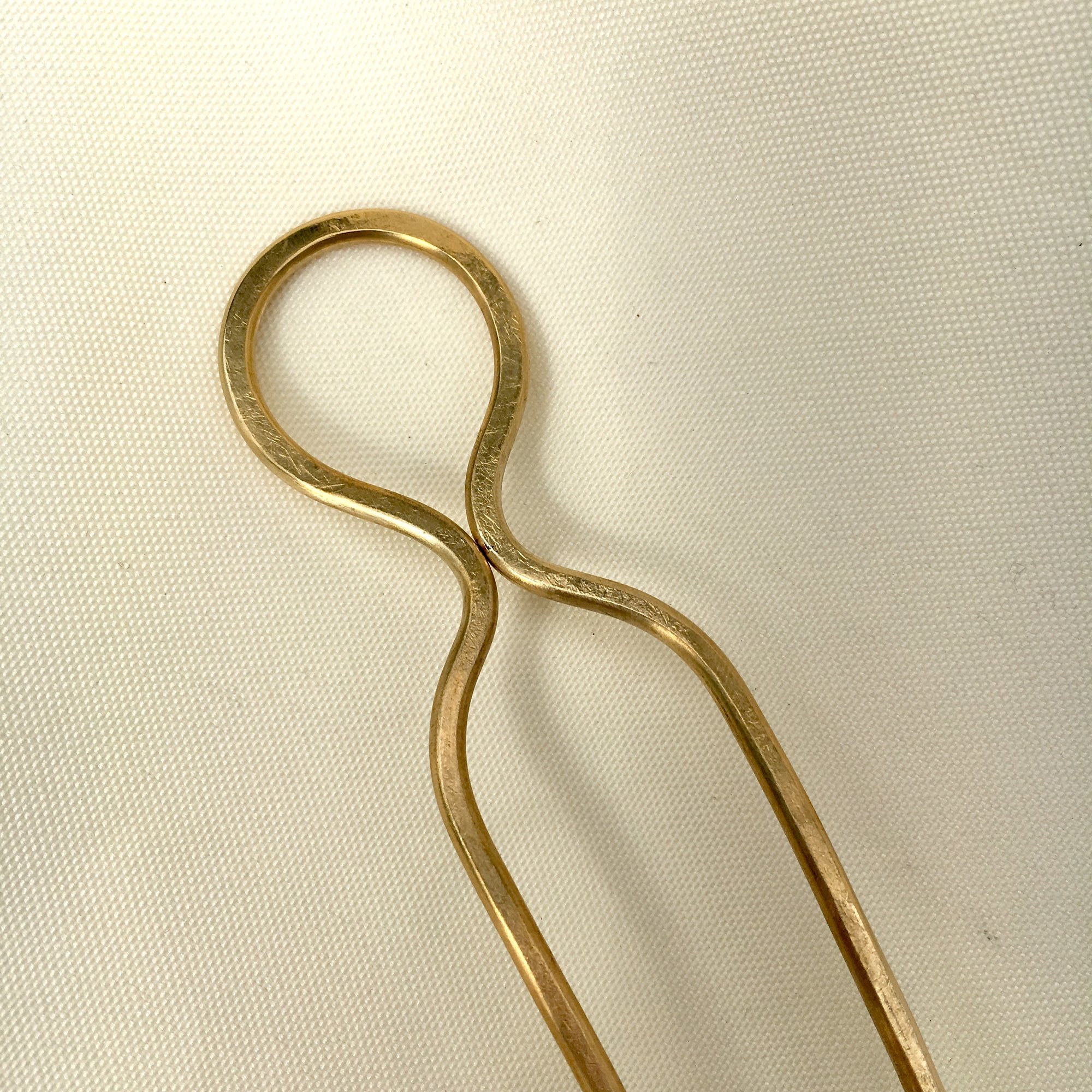 hand fabricated sturdy brass hair pin with a light organic texture