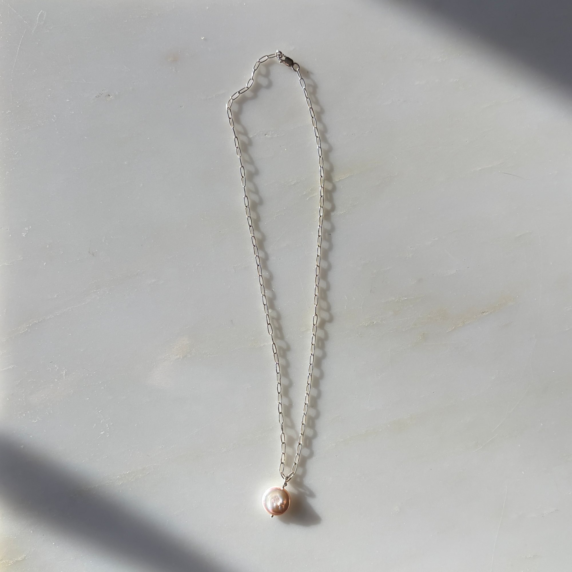freshwater coin pearl along a sterling silver chain