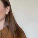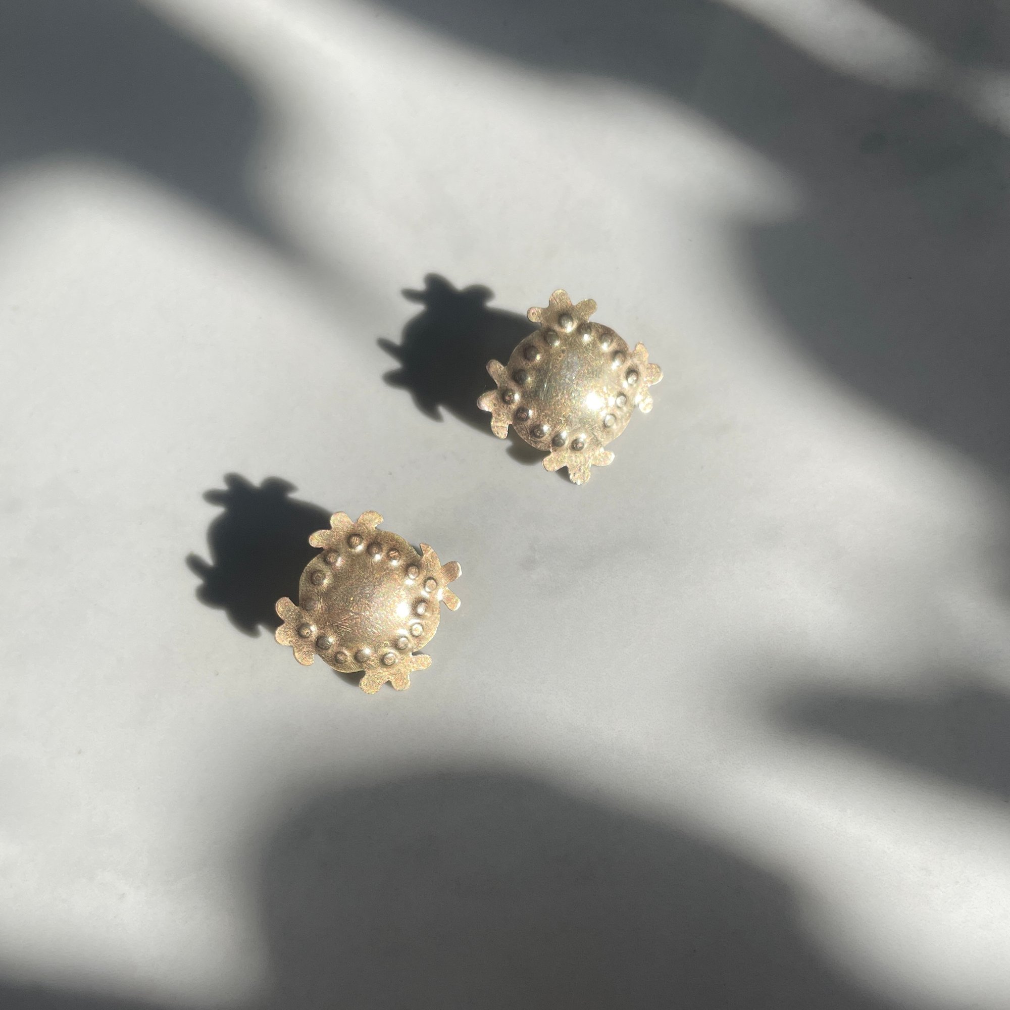 hand fabricated brass earrings textured with handmade stamps, a nod to the winter solstice